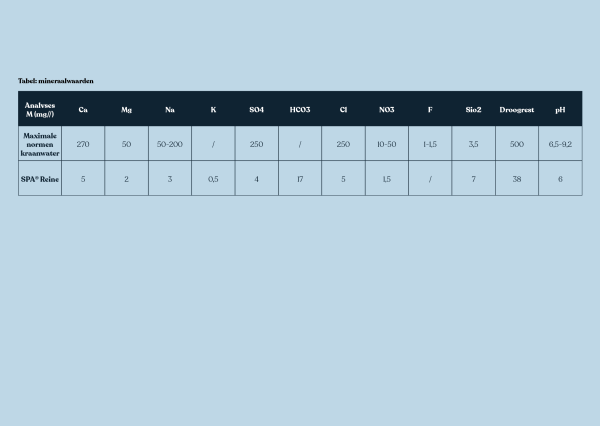 Als we de mineraalwaarden van SPA® Reine vergelijken met de wettelijk bepaalde maximale hoeveelheid mineralen van kraanwater, kom je zelfs tot een heel verrassende vaststelling: