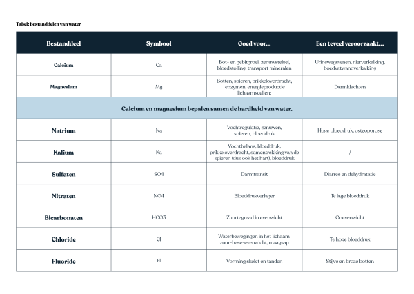 Je ziet het: het is veel beter om je inname van zout en andere mineralen te beperken. Kies dus voor mineraalarm water. Want voldoende water drinken (1,5 liter water per dag) blijft ontzettend belangrijk voor je gezondheid. Zorg er enkel voor dat je bij het drinken niet te veel mineralen binnenkrijgt.